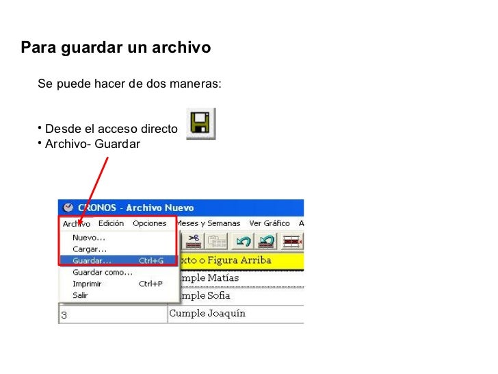 guardar un archivo Se puede hacer de dos maneras: l Desde el acceso directo l Archivo- Guardar